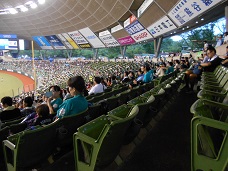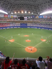 交流戦は年間パスでは入れず、別途外野芝生席の券をもらう、という仕組みになっているので、内野席はほぼ黄色いハンシンファソで占められ、おいらたちはレフト外野席へ。阪神ファソたちには、神宮の試合とセットでバスで移動する「阪神応援ツアー」というのもあって、しかもファイターズ側がツアー編成に関与している、というカネの亡者ぶり。