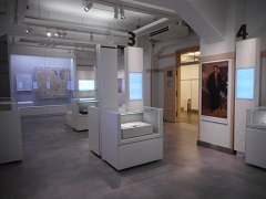 旧構造物を利用しているので、展示室は多数の小さめの部屋がなっています。これは右の方に勝海舟像があるので、旗本・御家人の世界のコーナーだと思います。二階で開館記念の特別展「港区指定文化財――悠久の旅人―ー」が開催されていたが(写真撮ると怒られそうなので撮りません)、泉岳寺蔵の加藤信清「観音蓮舟図」(細かく書いた経文を線とした仏画)など目を瞠るものありました。眼福、眼福。